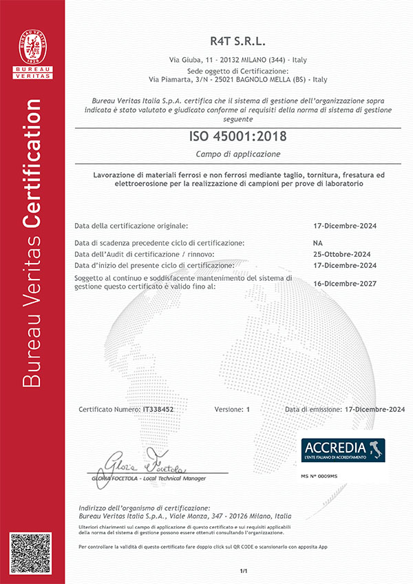 Ready for Test Srl opera in conformità ai requisiti della ISO 9001:2015, in accordo con specifiche nazionali, internazionali e personali dei Clienti. R4T assicura un servizio veloce ed accurato entro tempi brevissimi.