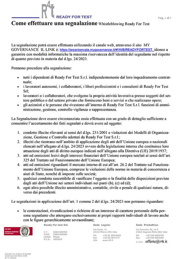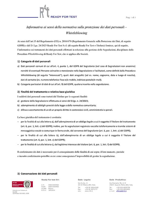 Ai sensi dell’art.13 del Regolamento (UE) n. 2016/679 (Regolamento Generale sulla Protezione dei Dati, di seguito GDPR) e del D. Lgs. 24/2023 Ready For Test S.r.l. fornisce l’informativa sui trattamenti dei dati personali effettuati in relazione alla gestione delle Segnalazioni, disciplinate dalla Procedura Whistleblowing di Ready For Test, che si applica alla Società.
